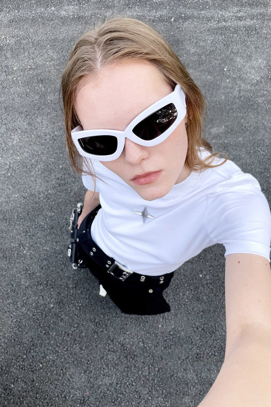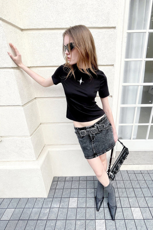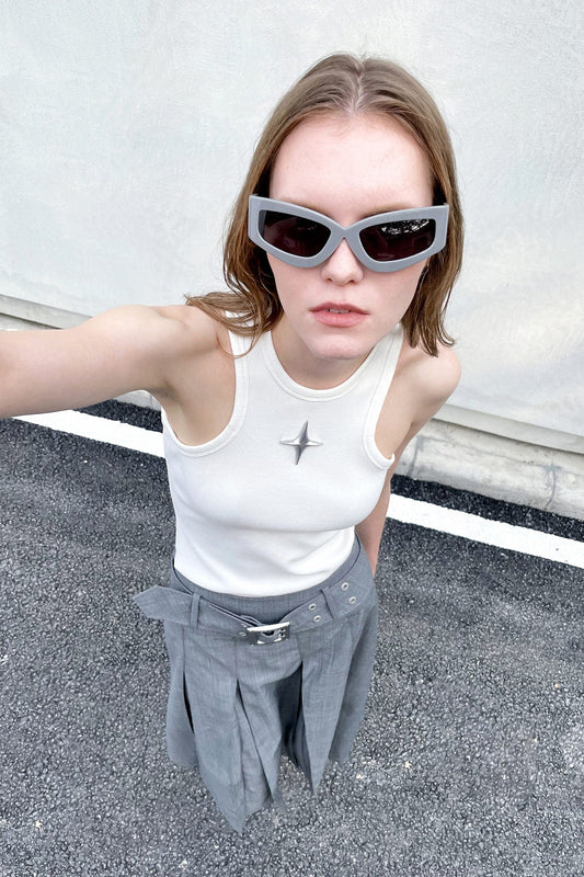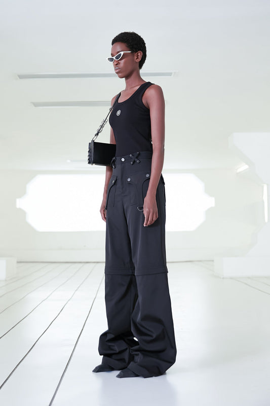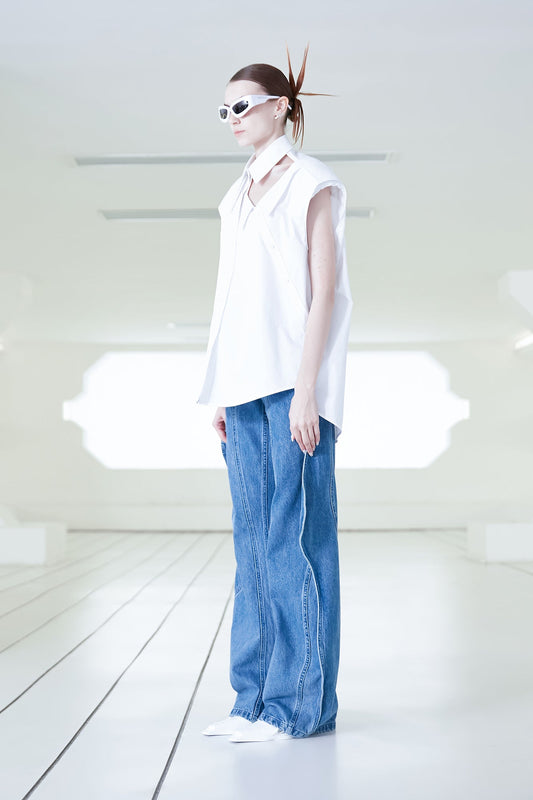 Shoulder-padded asymmetric double-neck wide-shoulder top